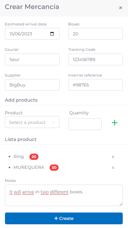 - Tracking code: the one provided by the courier. When you create the entry, you will not know the code. You can put "ND" (not defined) and when you have it, edit the entry.