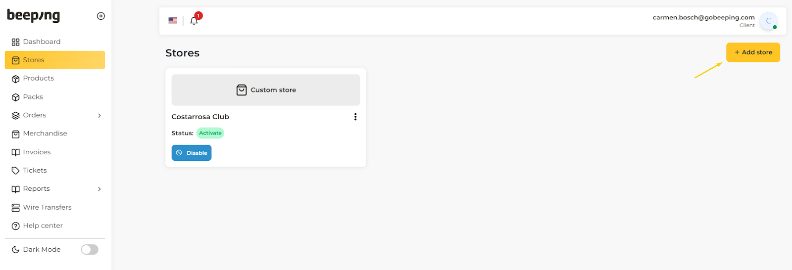 Once the app has been installed in Shopify, the shop panel on the Beeping platform will open again and the shop we have just created will appear.