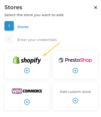 A window will open and you will be displayed by the Shopify or Woocommerce options. You will need to select the platform corresponding to your store. In the case of a Shopify shop, click on the Shopify option in the pop-up window, and click Next.