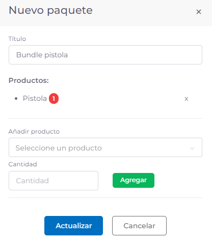Al clicar en Agregar pack, saldrá la columna de la derecha comentada anteriormente. El primer producto se realizará como en el caso anterior: