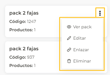 - Ver pack: al colocarte sobre el botón, te mostrará los packs creados de ese producto.