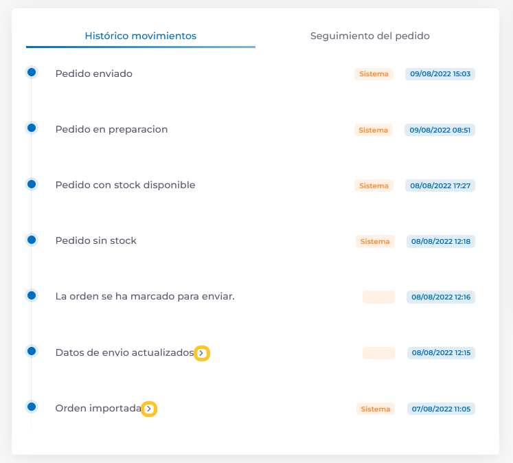 Si pulsas la flecha que aparece en algunos de los movimientos, podrás ver información adicional de dicho movimiento, como la información completa del pedido o qué edición se ha realizado.