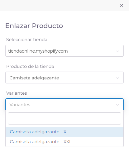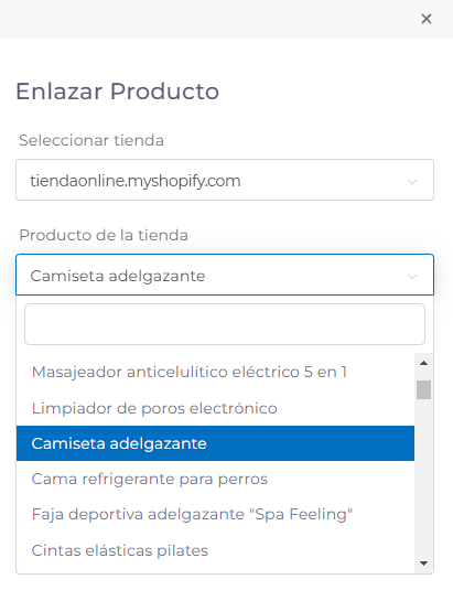 Al pulsar en él, te aparecerá de nuevo la ventana de antes, aunque en este caso encontrarás tu producto vinculado a tu tienda y bajo de este, otro campo con desplegable para realizar de nuevo todo el proceso anterior.