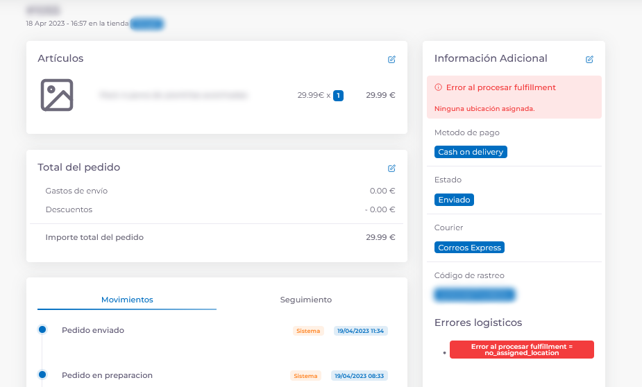 Este error surge cuando la configuración de inventario de tu producto en Shopify, no está configurado correctamente y está seleccionado un fulfilment que no es el que se utiliza por defecto, que sería el que nos permite actualizarte la información del pedido de forma correcta.
