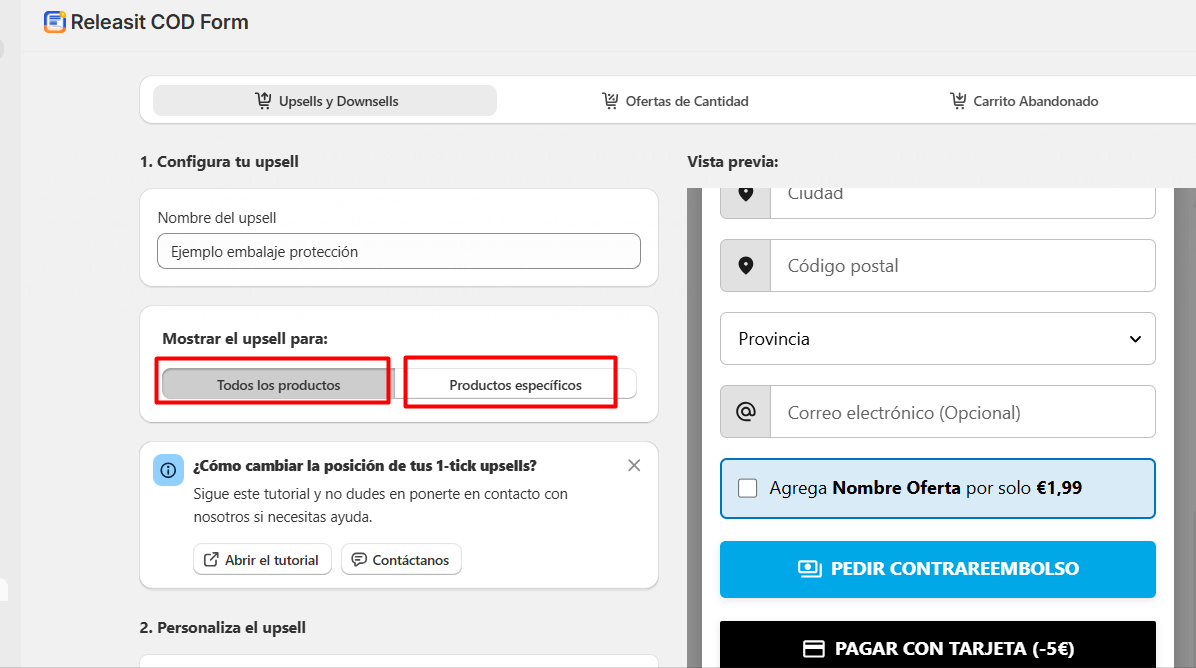 Conecta el Upsell al producto que has creado en shopify.Preselecciona el Upsell en el formulario de compra.