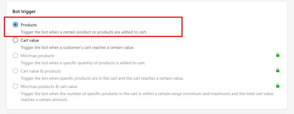 A Bot Trigger: En el campo "When a customer's cart includes:" selecciona: