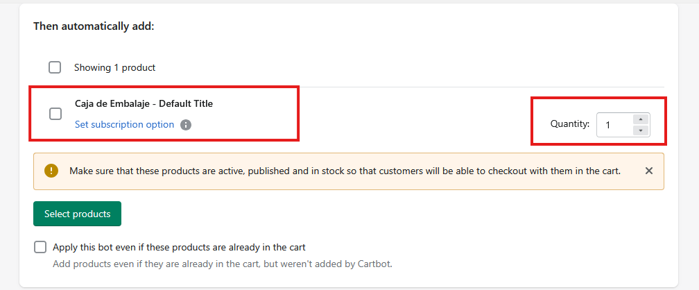 Configura Shopify para que añada automáticamente el producto deseado a cada pedido que requiera este tipo de embalaje o flyer. Esto asegurará que el producto se transfiera correctamente a Beeping.