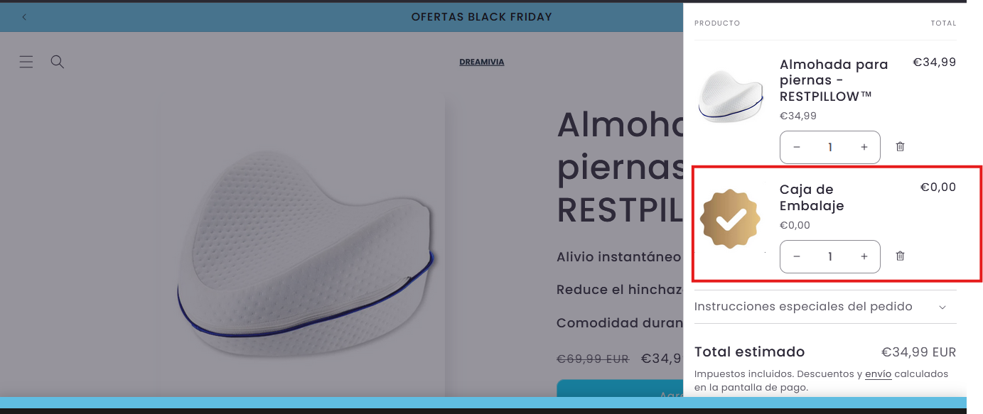 ▶️Verifica que el producto de embalaje o el flyer se añade automáticamente y que no aparece ningún pop-up de confirmación.